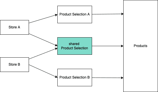 we recommend creating a separate, shared Product Selection for the Products that the Stores have in common: