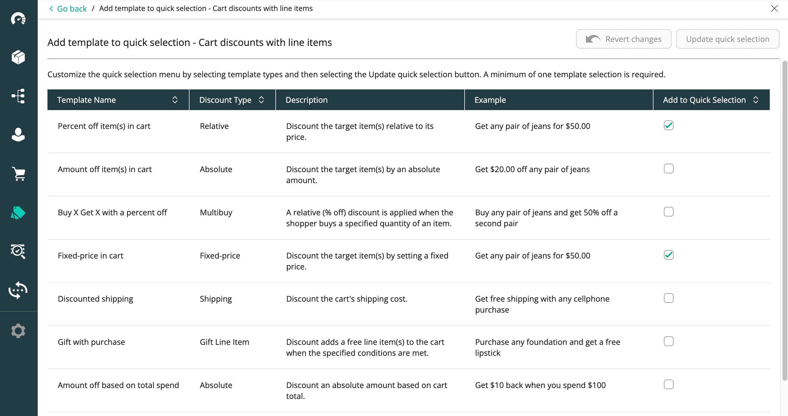 - Select or clear the checkboxes in the Add to Quick Selection column to add or remove Discount templates.