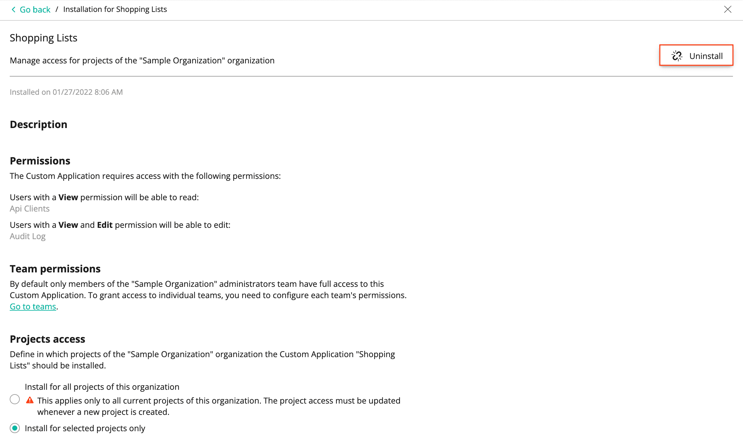 - all the current Projects of the Organization. To do so, choose Install for all projects of this organization.