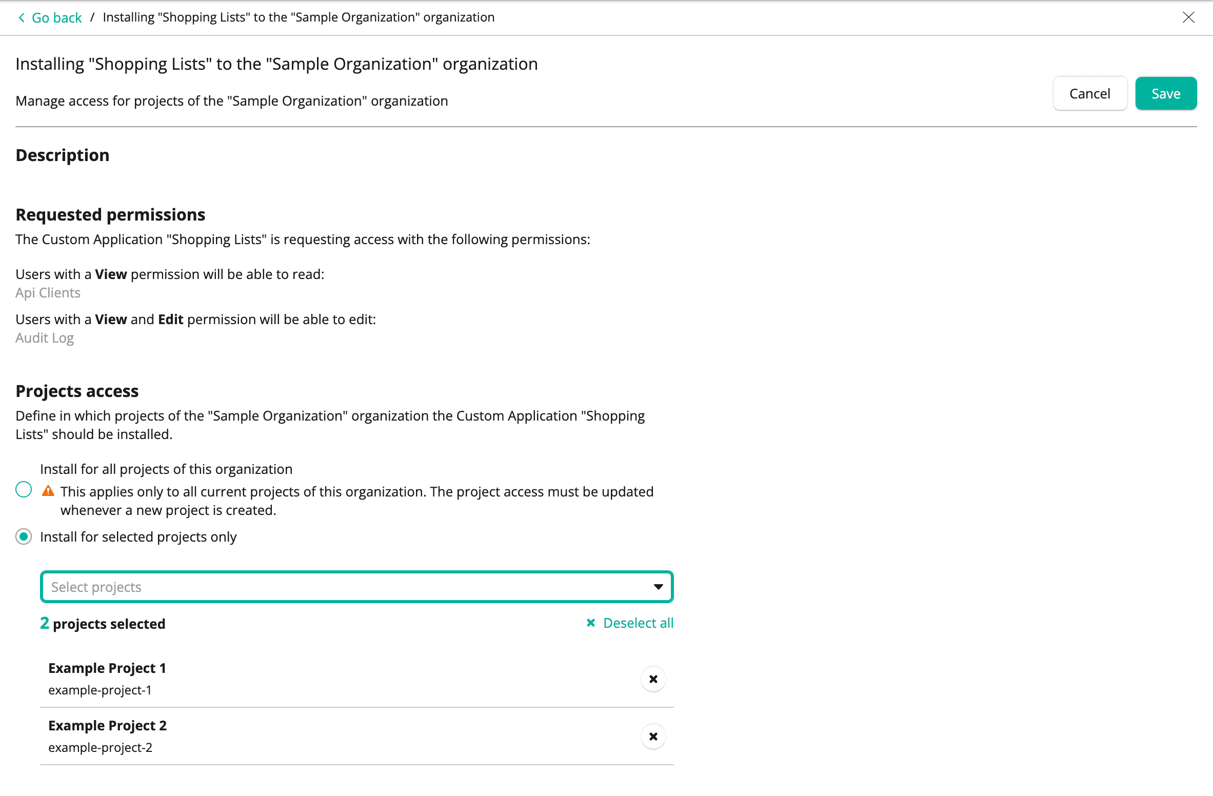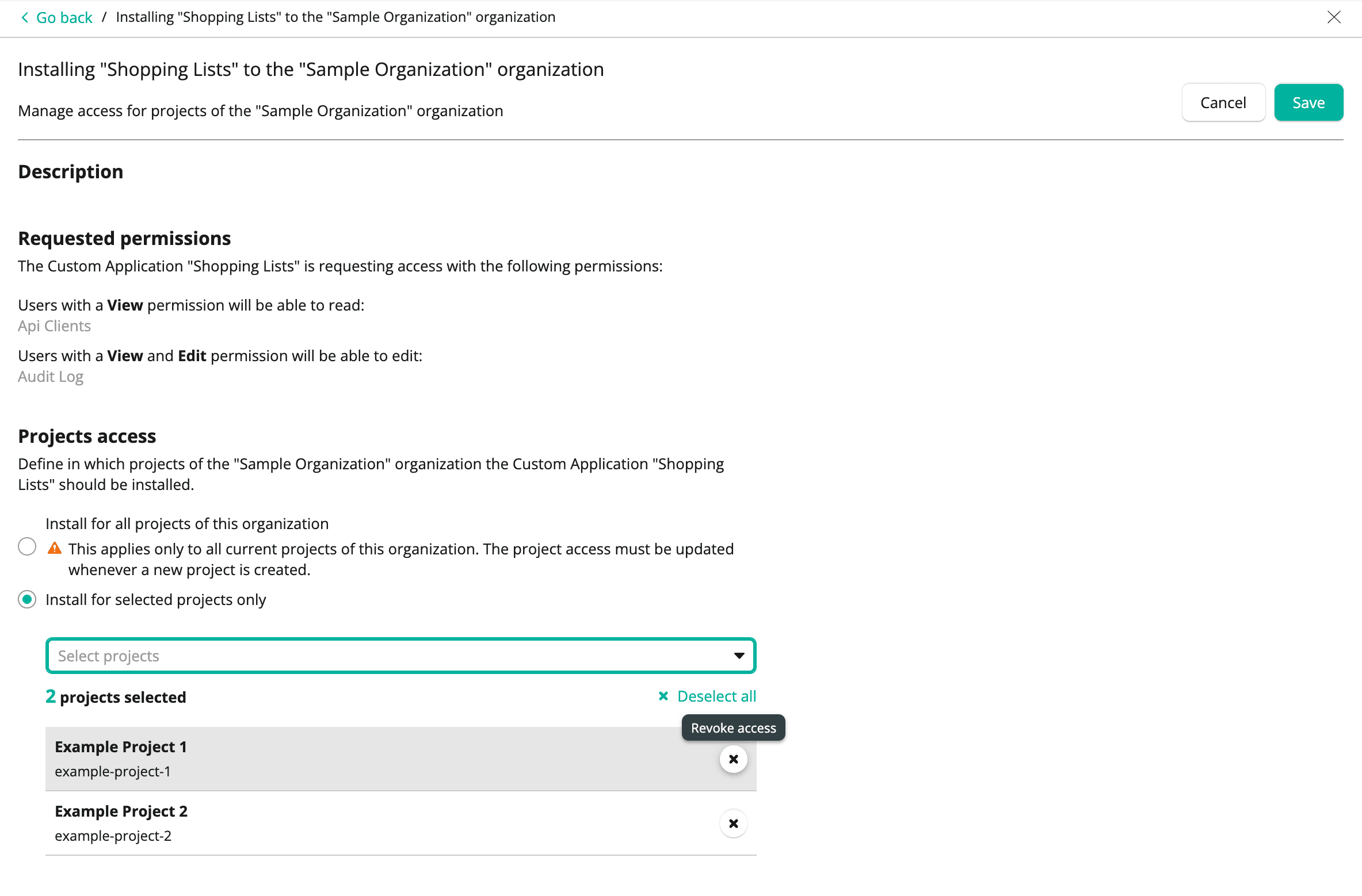 Install for selected projects only to grant Projects access for selected Projects of the Organization and then select the Projects from the Select projects drop-down list. To revoke access for selected Projects of the Organization, click the close icon (Revoke access) next to the desired Project in the projects selected list.