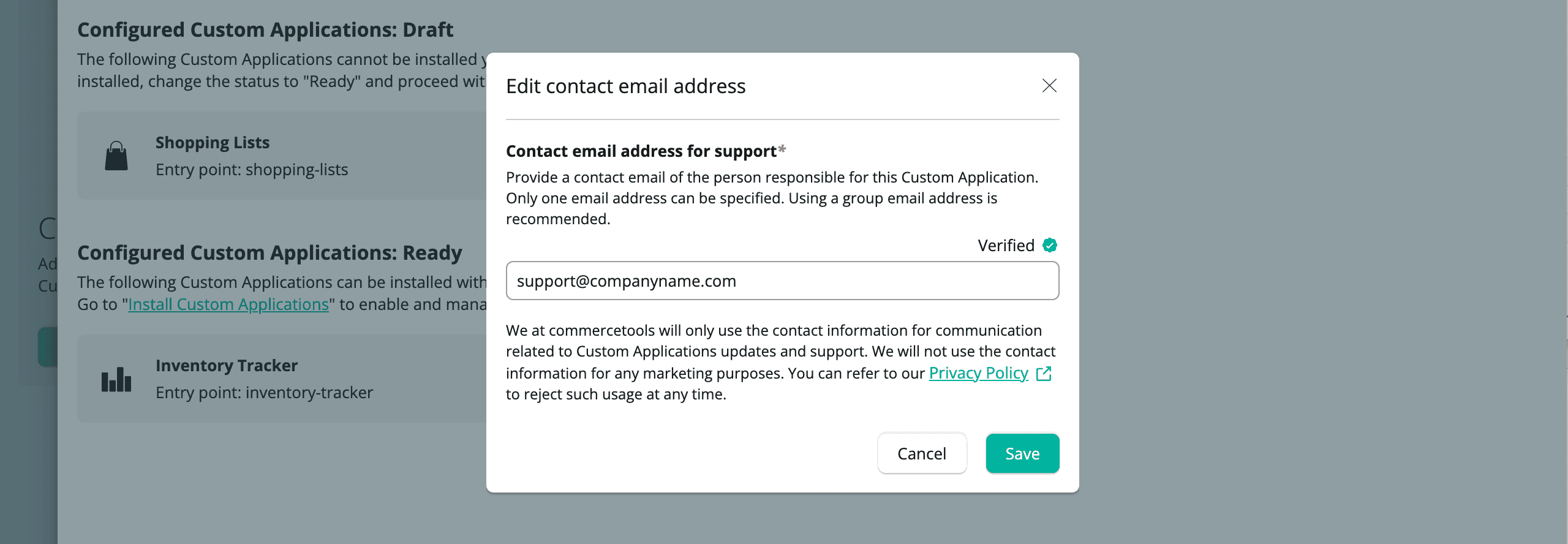 Working on Custom Applications requires commercetools to contact the developers or owners of Custom Applications from time to time, primarily for updates and support purposes. Hence, we require that every Organization using Custom Applications provides a valid and verified contact email address.