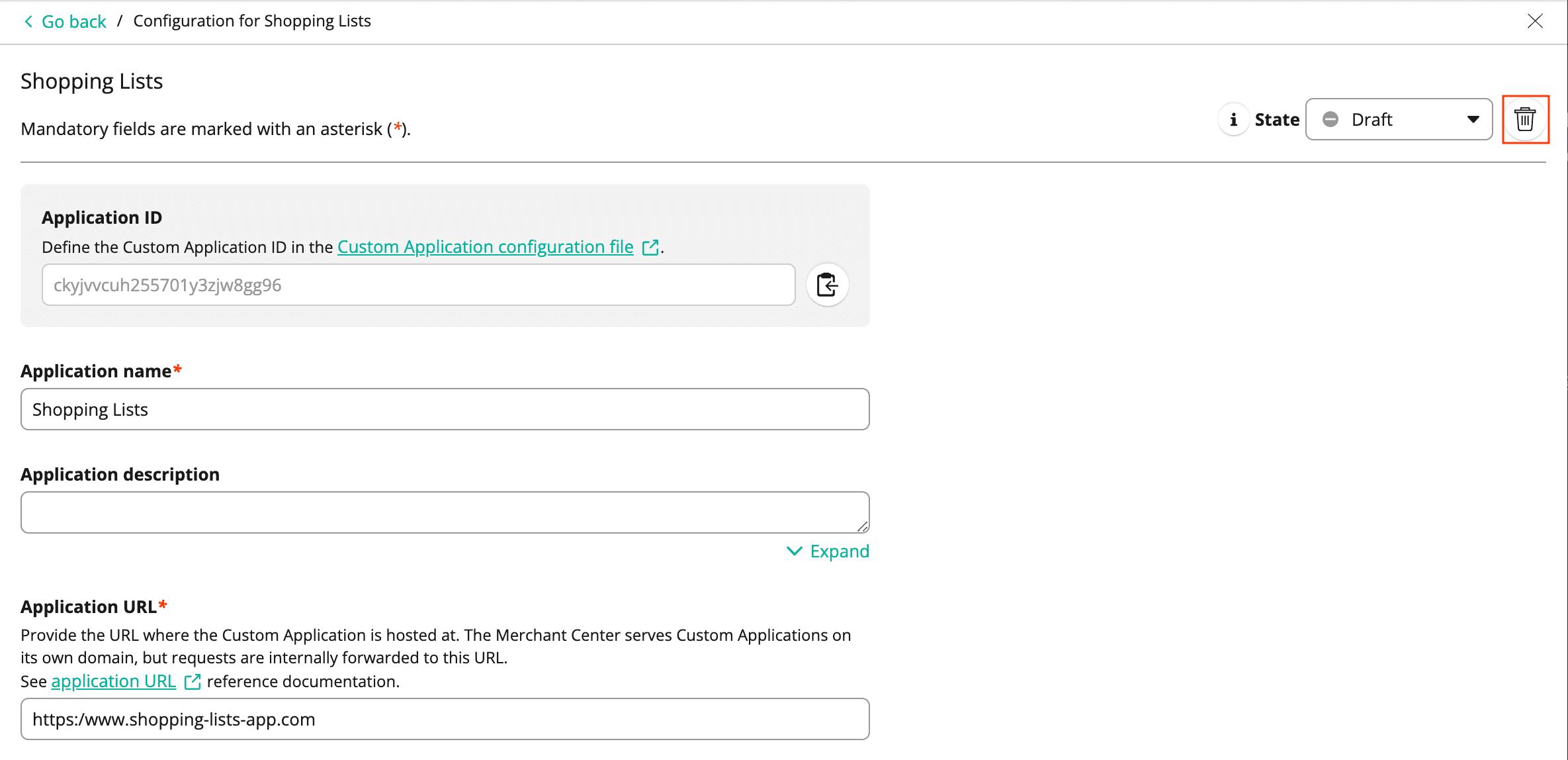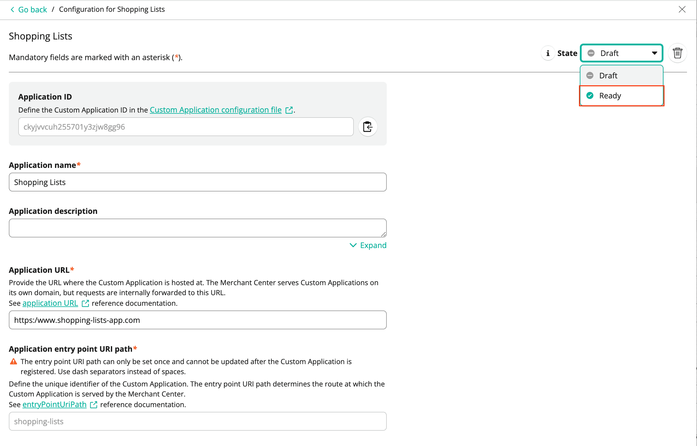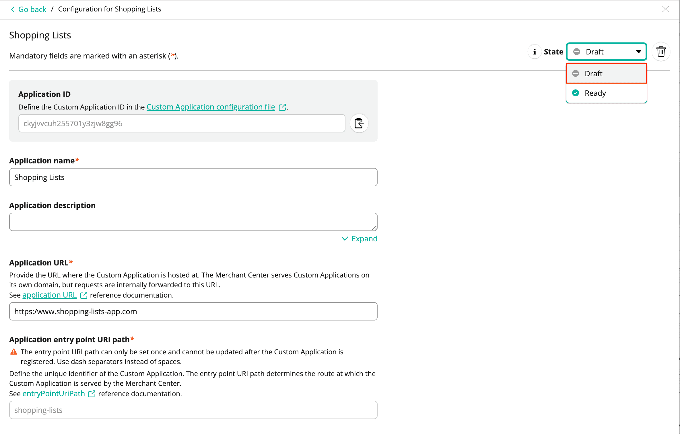 Now, the configuration is stored in the Merchant Center and a Custom Application entity is created. The Custom Application is currently in the Draft state.