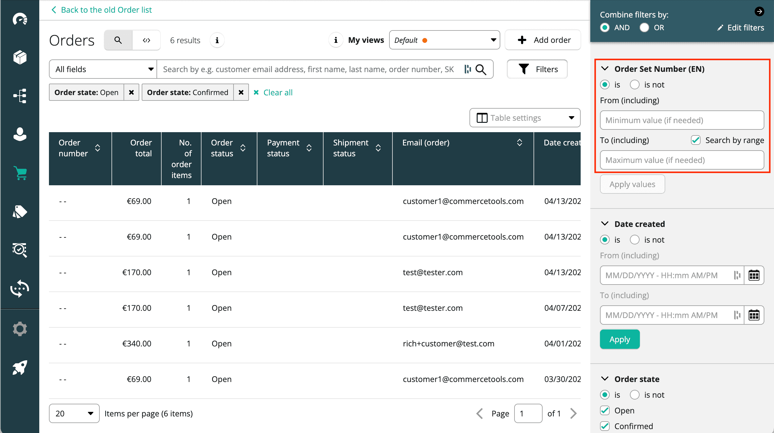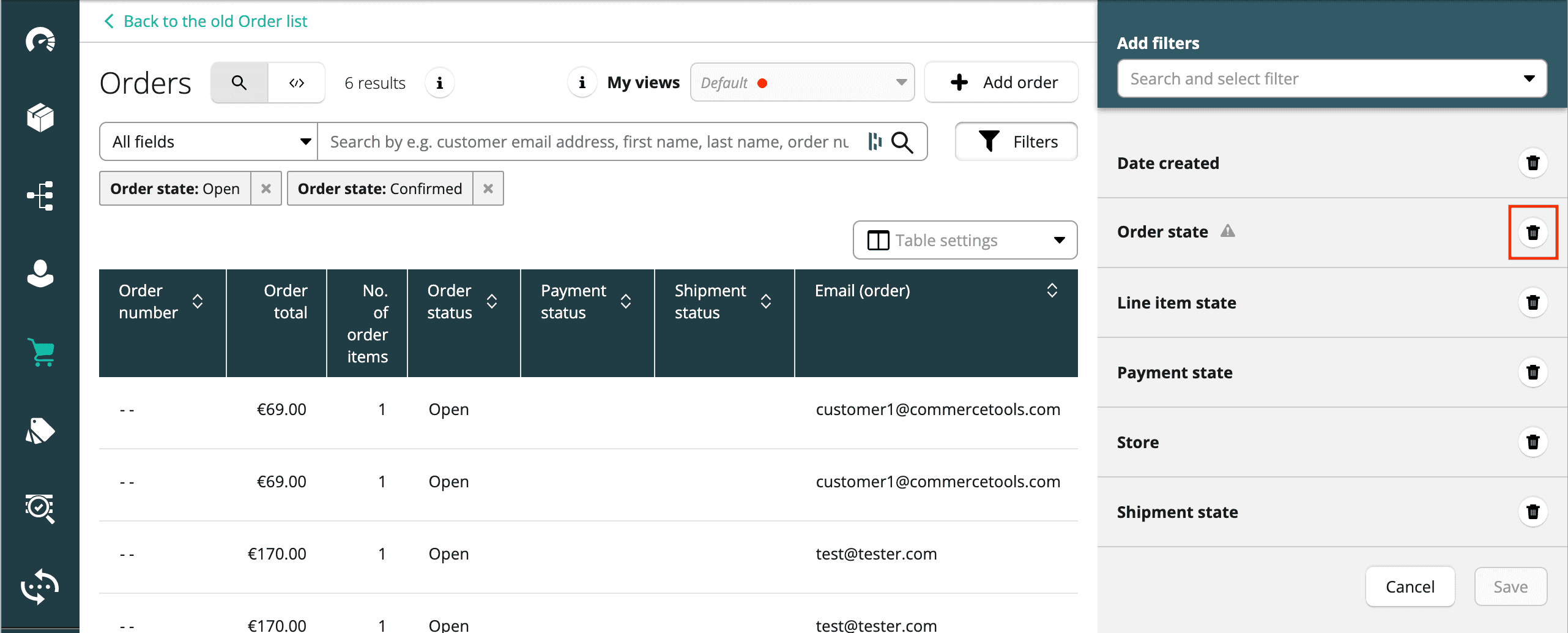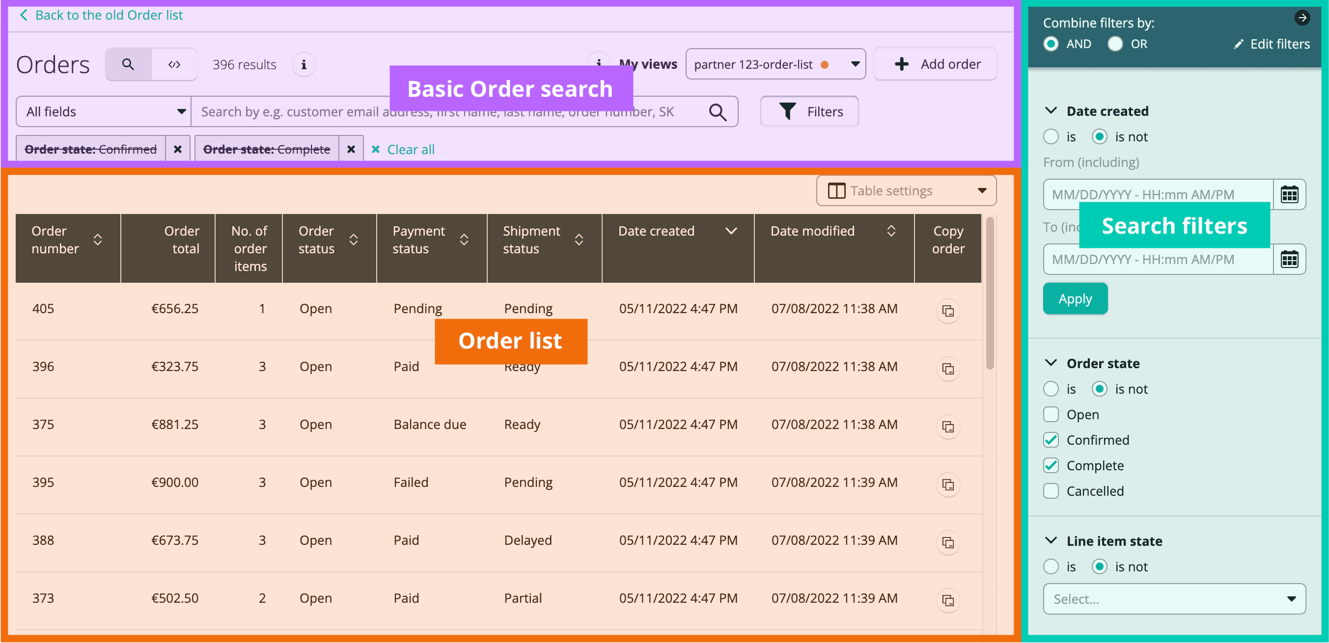 - Order state: filters based on the state of the Order (Open, Confirmed, Complete, Cancelled).