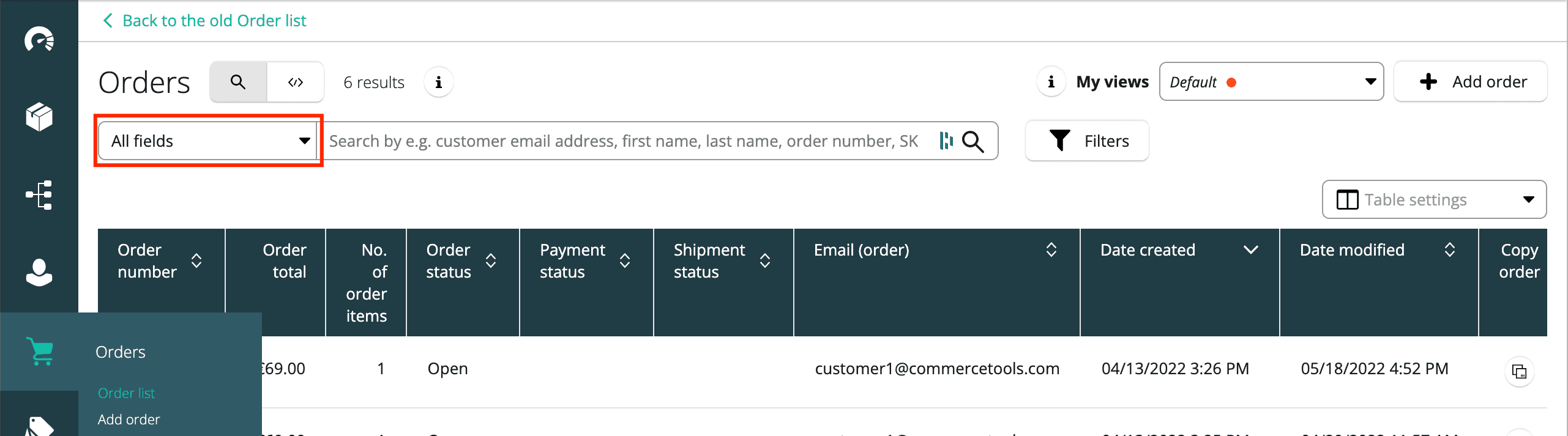 - Order list: displays Orders that match the current search query; it allows you to access the Order detail page.
