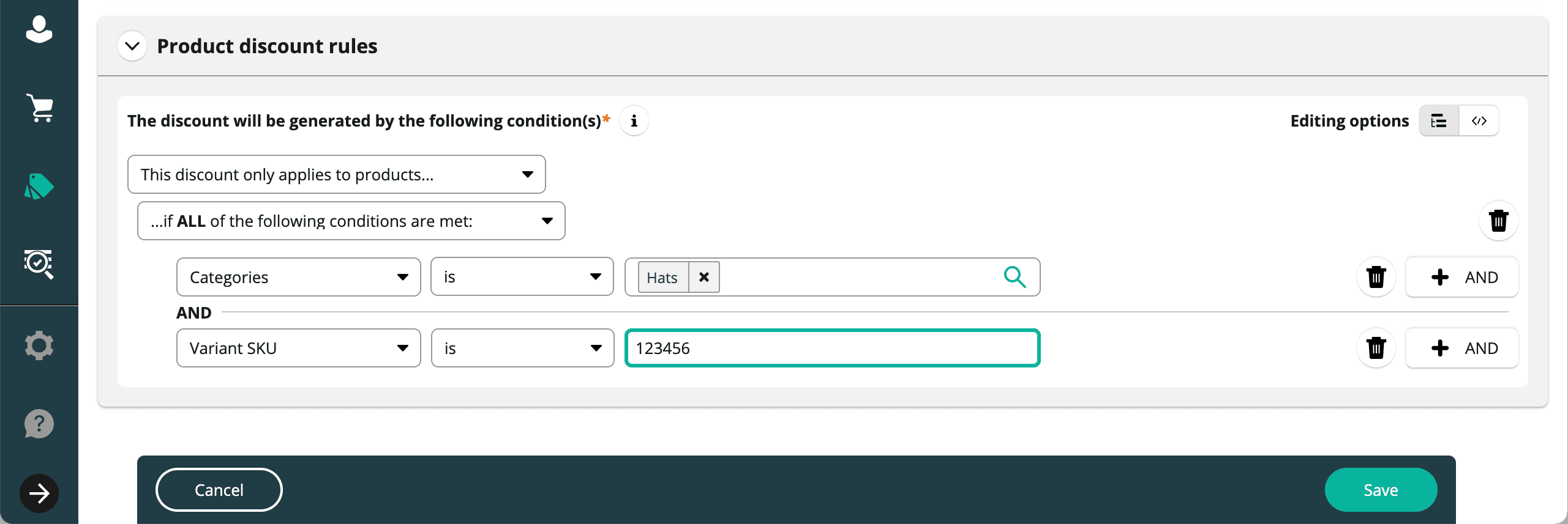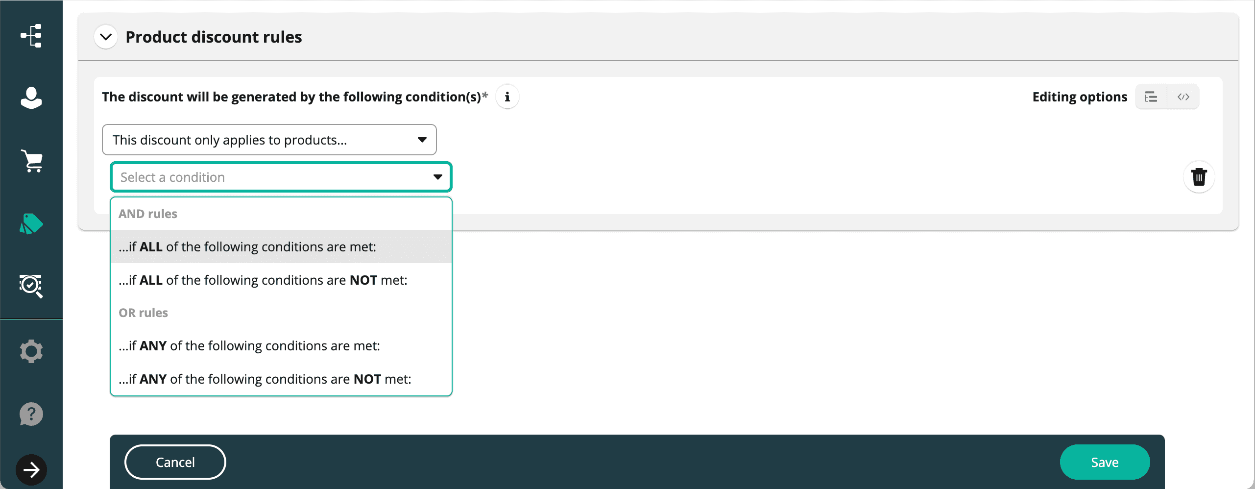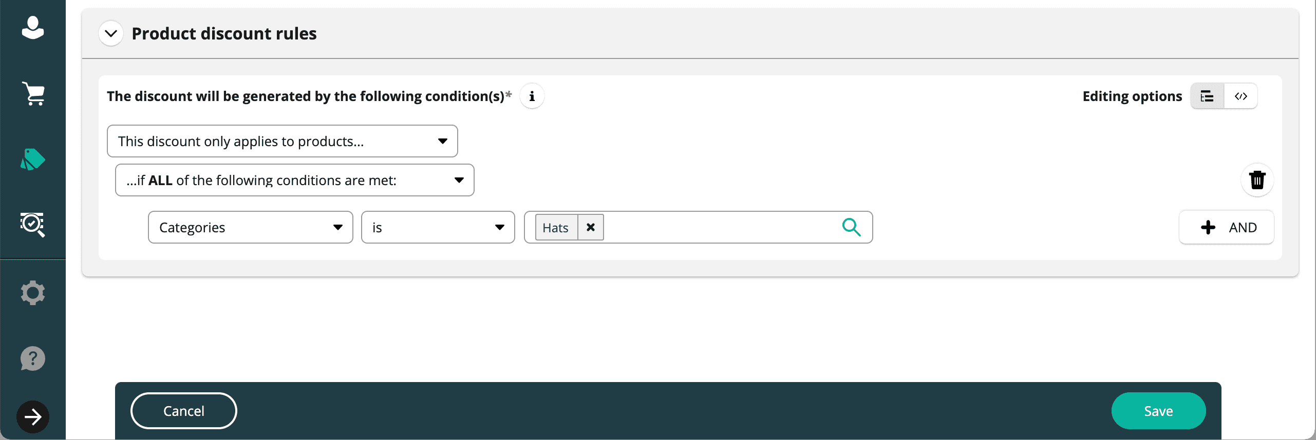 - ... if ALL of the following conditions are met: all rules defined must be true for the Discount to apply. The AND button is displayed when creating additional rules.