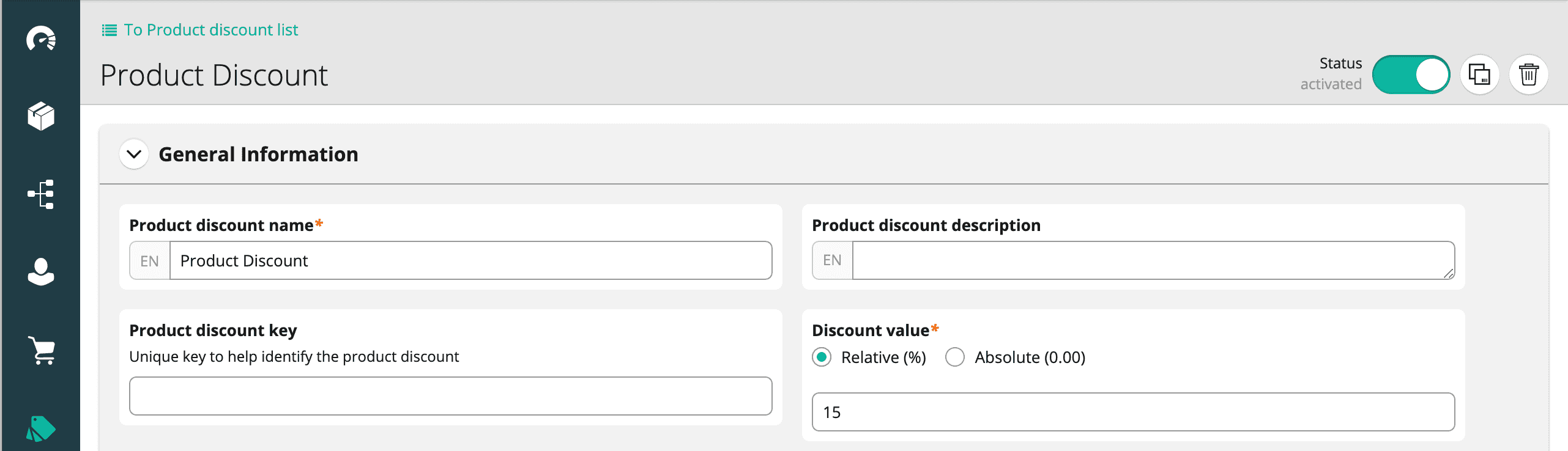 Discount value (required): the Discount type (Relative or Absolute) and the percentage or amount.