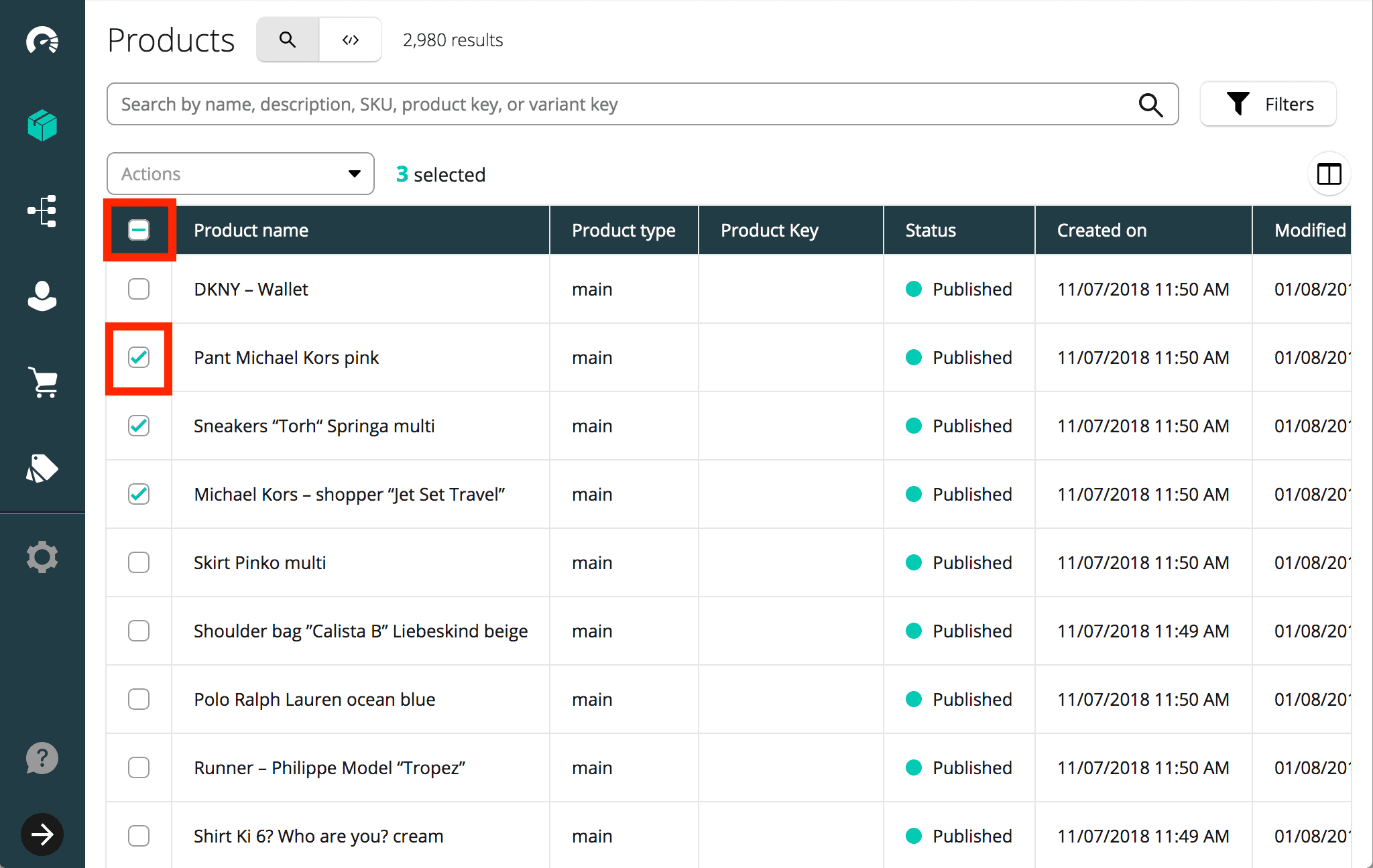 You can perform the same action on multiple Products simultaneously or export a selection of Products from the Product list. For example, this can be useful in conjunction with the search feature to publish all the Products in a specific campaign or sale.