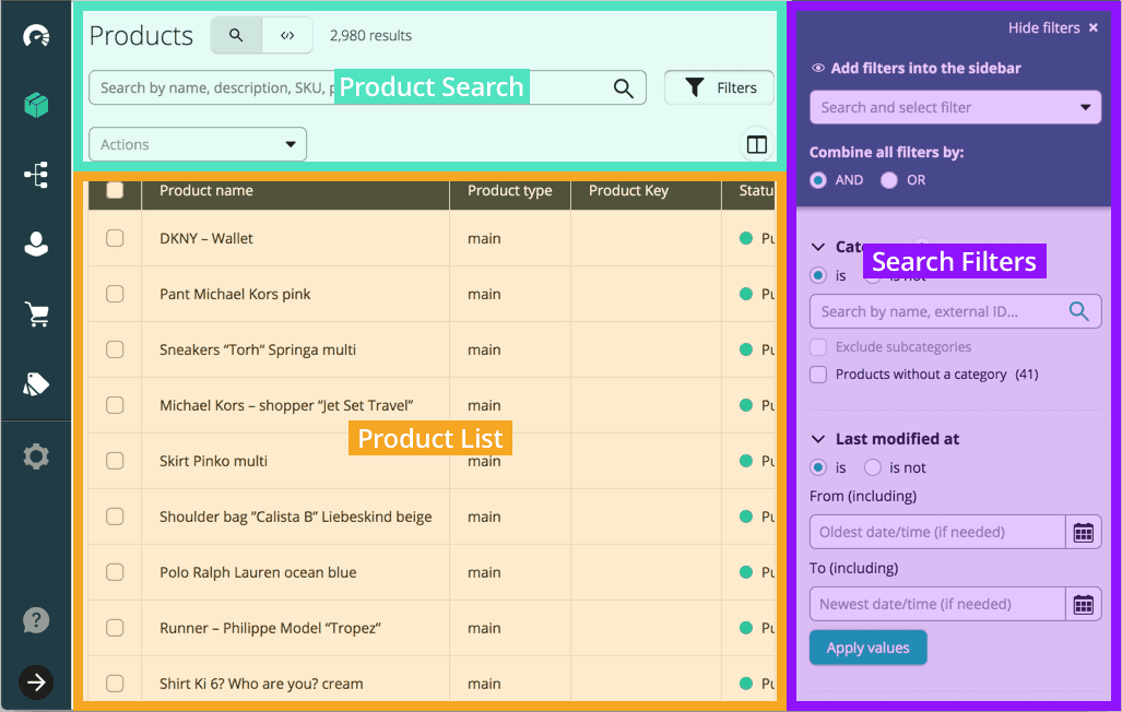 - Product list: displays Products that match the current search and filters, and lets you access a Product detail page.