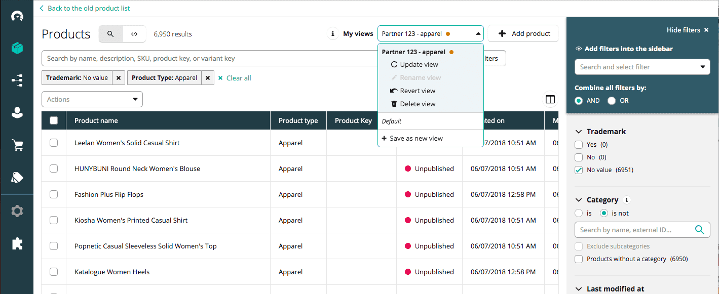 You can customize the layout (the visible columns in the Product list and Filter sidebar) and/or your searches, and save them as new views. Any changes applied to the layout, search, or filters is denoted by an orange dot in the My views drop-down.
