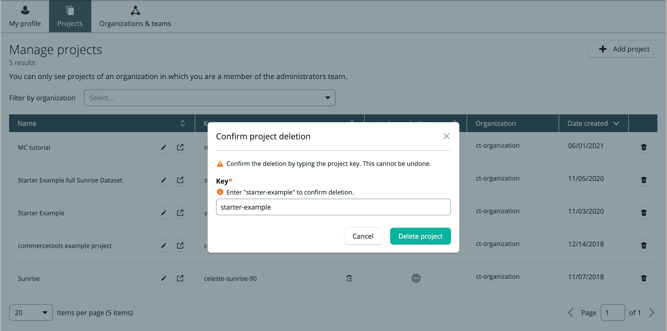 Administrators can view and manage Projects you’ve been added to from the Manage projects screen. The Filter by organization drop-down helps Administrators who manage a large number of Projects to filter and view Projects in a specific Organization.