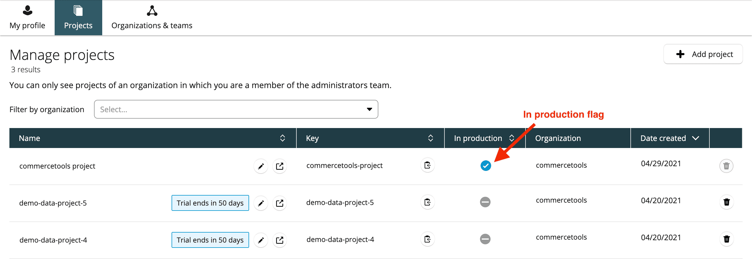 The In production flag lets our Support team know that a Project is live and accepting traffic from customers. By default, this flag is deactivated for all Projects that are created.