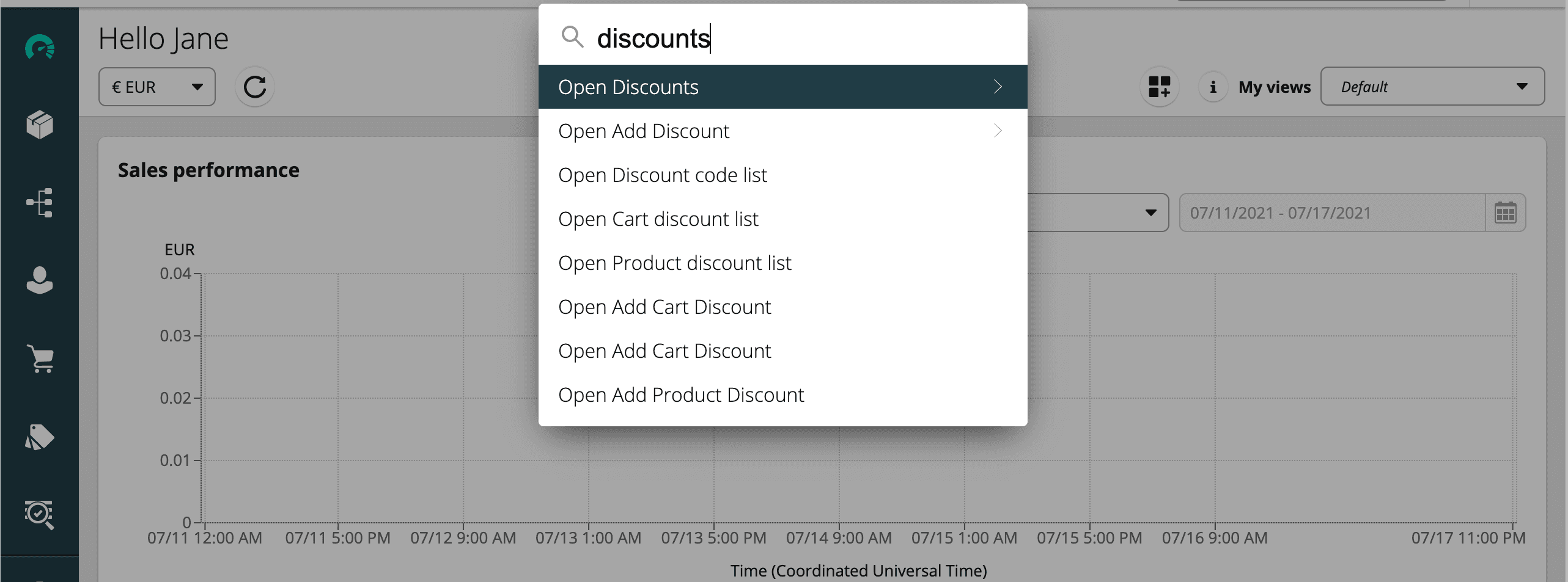 Enter the search term (for example, Discounts). The search results are auto-suggested as you type.