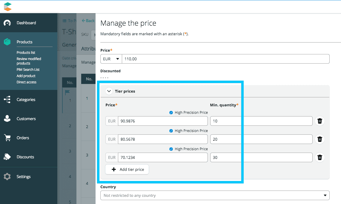 When editing a variant’s tier price, the Merchant Center now supports the management of high precision prices in the “Manage the price” view in the Products section.