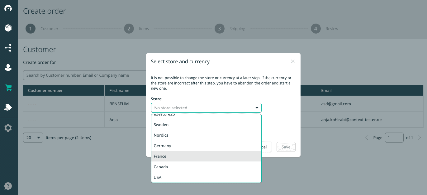 Depending on the user permissions one of the available stores can (or must) be selected at the beginning of the flow. In the next step, the list of selectable customers is filtered accordingly.