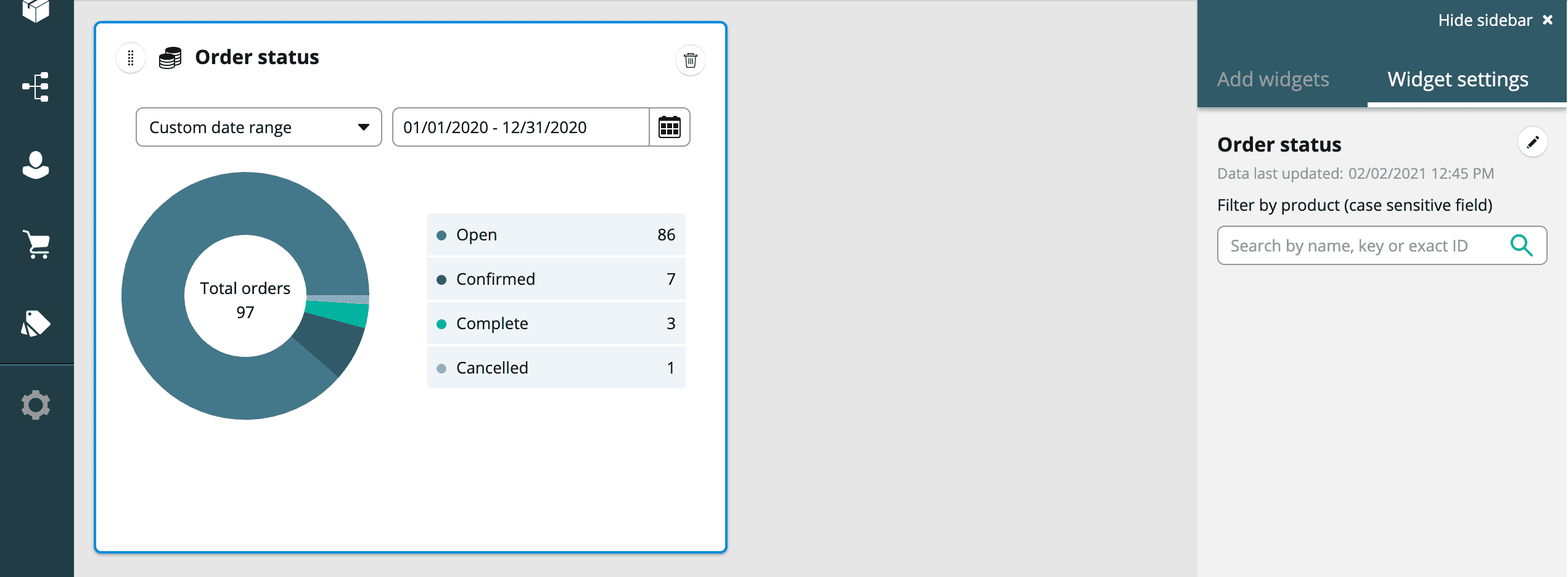 A new, customizable dashboard widget is available for you. With the Order status widget, you can view a breakdown of order data by order status, filtered by the time range and/or a product.