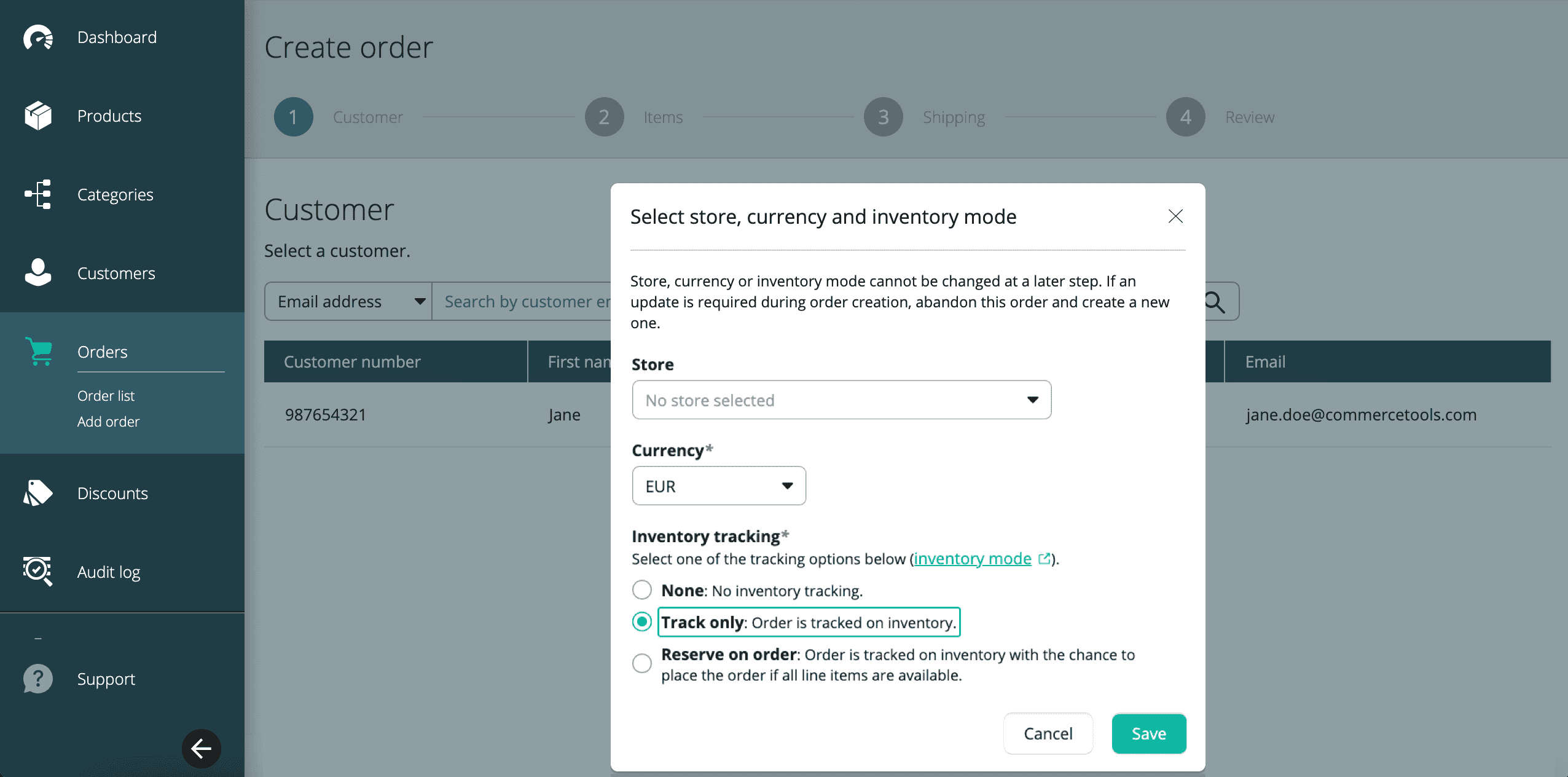 You can now select the following Inventory modes during Order creation under Orders > Order list in the Merchant Center: