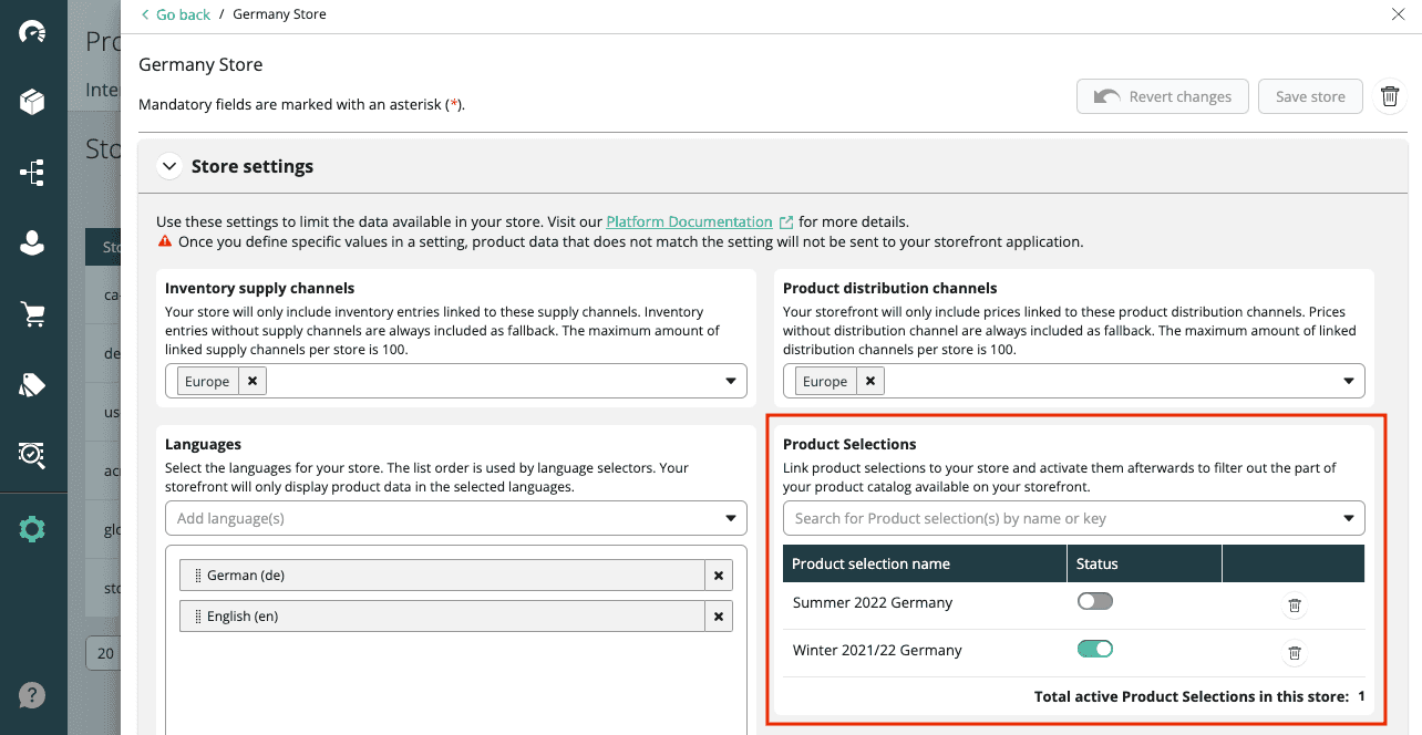 Product Selections allow you to manage the availability of Products across different Stores. With this feature, you can create individual catalogs or assortments for your brand sites, regional shops, or brick-and-mortar stores.