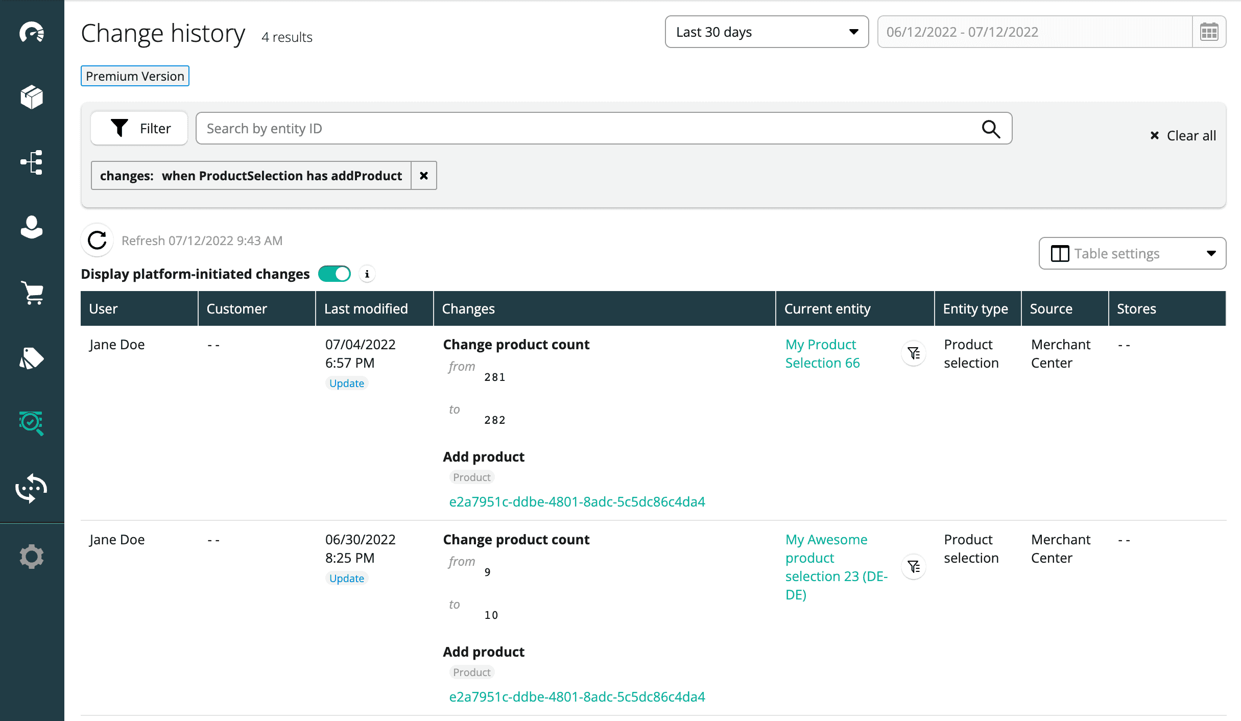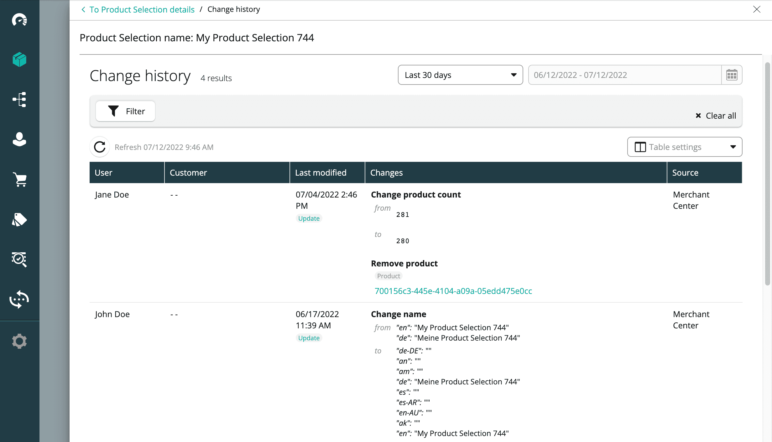 You can now view and filter changes to a Product Selection within the Change History table in the Merchant Center. Additionally, you can view Product Selection changes in a contextual view.
