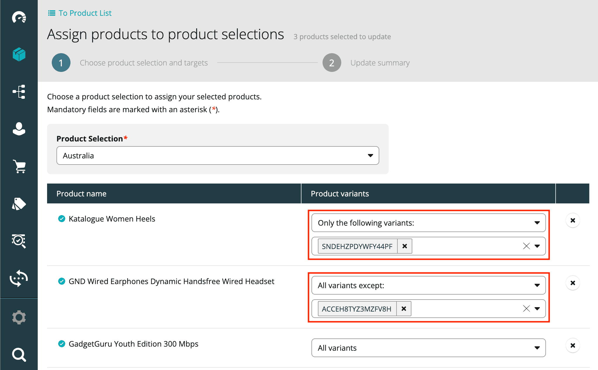 You can now include or exclude individual Product Variants from a Product Selection when assigning Products to the Product Selection. This can be done on the Product list during bulk assignment of Products or under the Product Selections tab of each Product to be added.