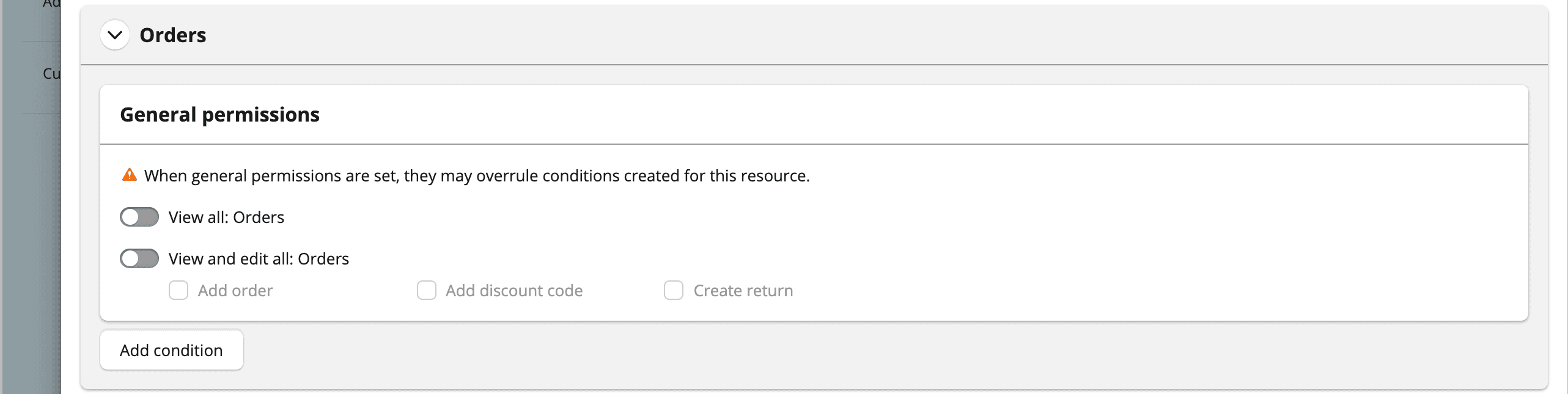 Granting view and edit permissions to Orders implicitly grants view access to certain fields in Customers, Products (and all dependencies of Products, like Product Discounts), Discount Codes, and Cart Discounts when using the Add order screen.