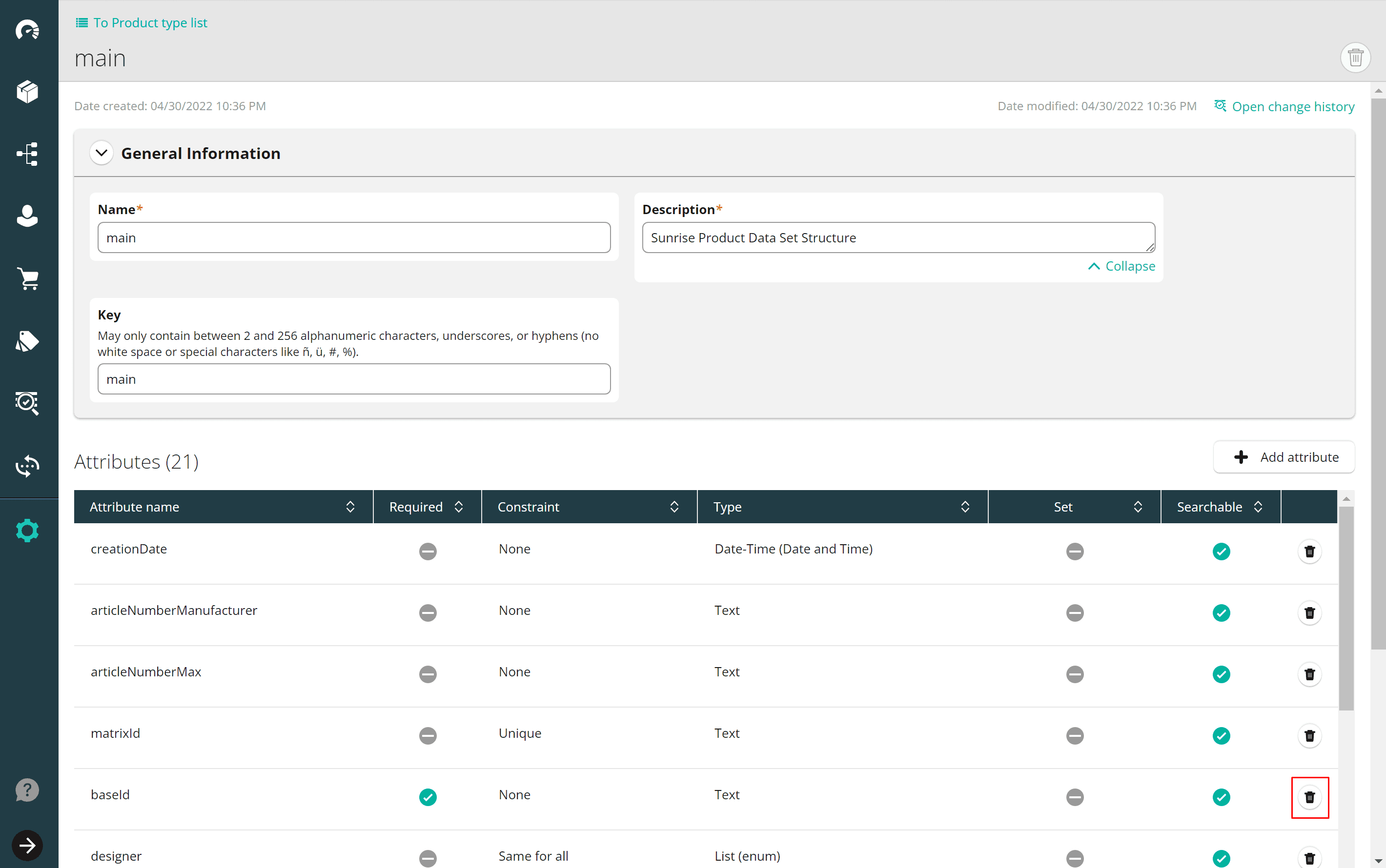 SUNRISE data includes a ProductType named main with the required Attribute baseId. This error is returned if a value for baseId is not included with your ProductDraft.