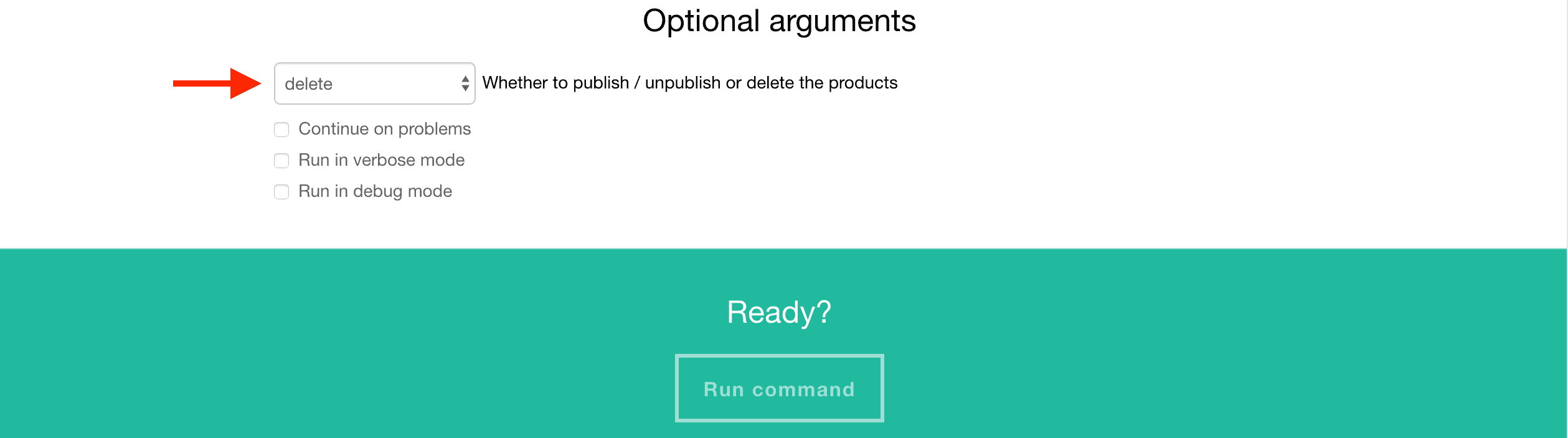 Before we actually delete the products we need to unpublish them. For doing this, we select the unpublish option in the Optional command arguments section as depicted in the figure below before we click the Run command button.