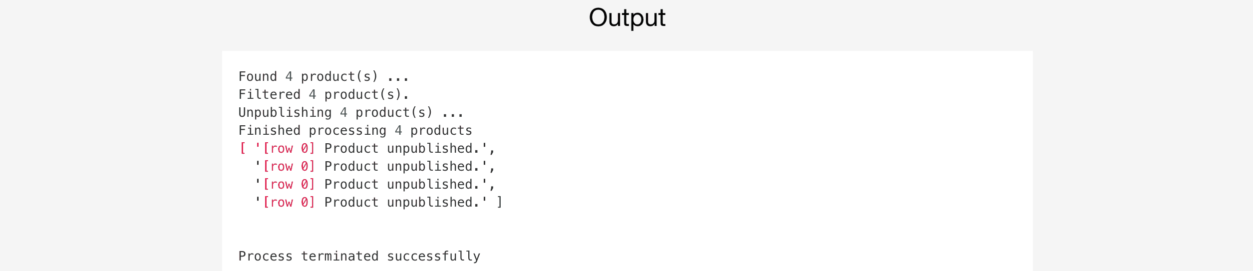 The response will look like in the image below, indicating that all 5 products have been unpublished.