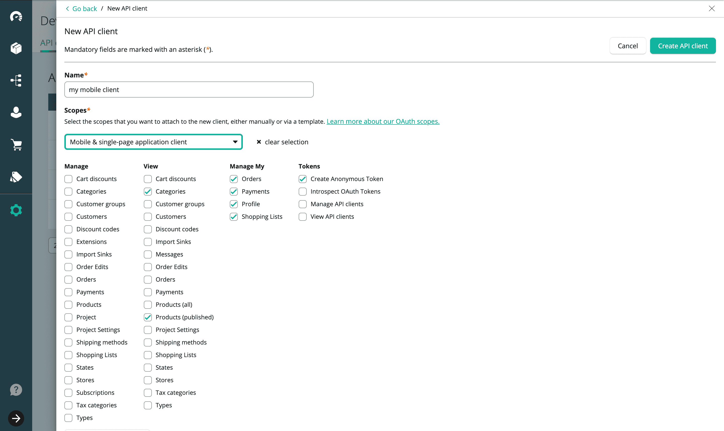 First, we need to create an OAuth client with the permissions view_published_products, manage_my_orders and manage_my_profile and view_categories. In the Merchant Center, go to the "Developer Settings" section and create a new API Client with the template "Mobile client & single-page application client" that contains the required permissions.